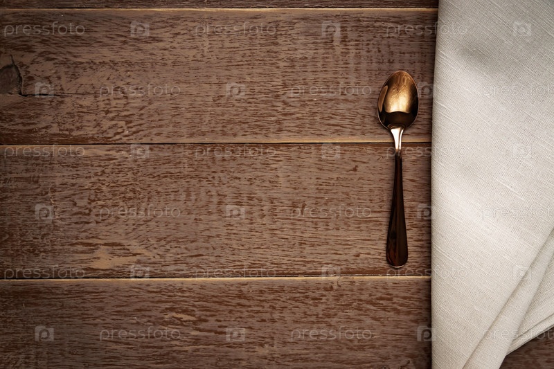 Вид сверху на тканевую салфетку бежевого цвета и чайную ложку на деревянном столе