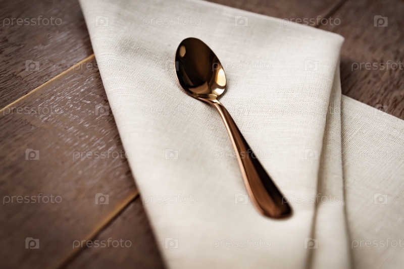 Закройте текстильную бежевую салфетку и подайте чайную ложку на деревянном столе