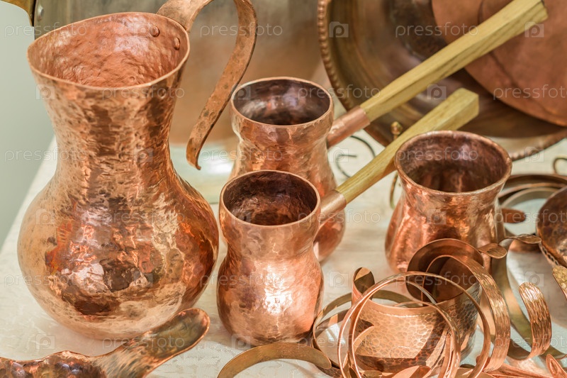 Винтажная медная посуда - турецкие кофейники и банки, выставленные на блошином рынке