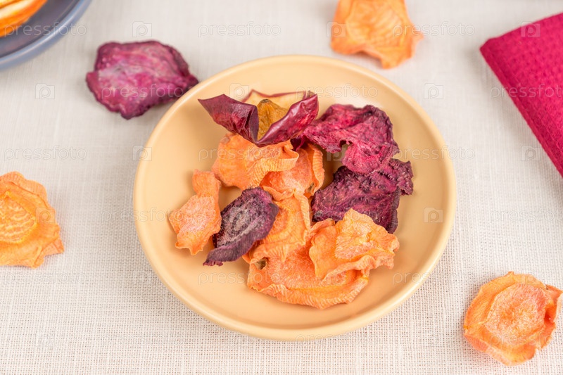Здоровое питание органическое питание. Нарезанное и сушеное яблоко, апельсин, морковь и свекла на текстильном фоне
