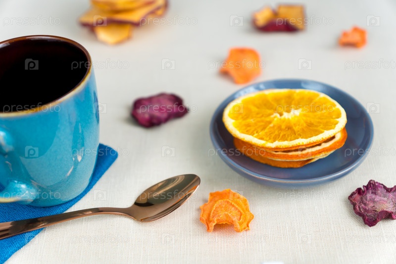 Здоровое питание органическое питание. Нарезанное и сушеное яблоко, апельсин, морковь и свекла и чашка чая на текстильной скатерти