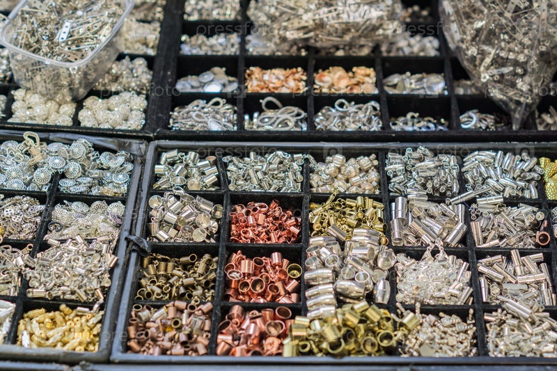 Ассортимент металлических бусин и фурнитуры для изготовления аксессуаров. Продажа материалов для рукоделия