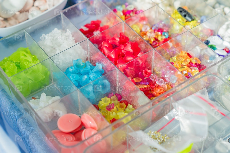 Красочная смесь стеклянных бусин. Разнообразие форм и цветов для изготовления ожерелий или браслетов. Материалы для поделок