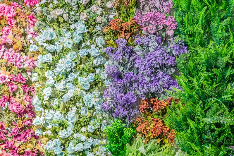 Искусственные цветущие розы оранжевого, синего и розового цвета фона