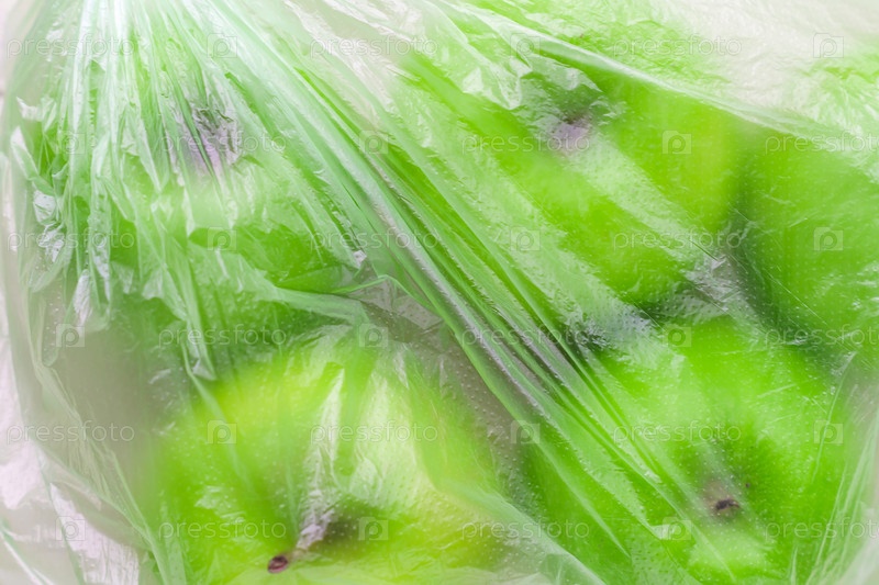 Свежие зеленые яблоки в полиэтиленовом пакете крупным планом. экологическая концепция неэкологического использования пластика