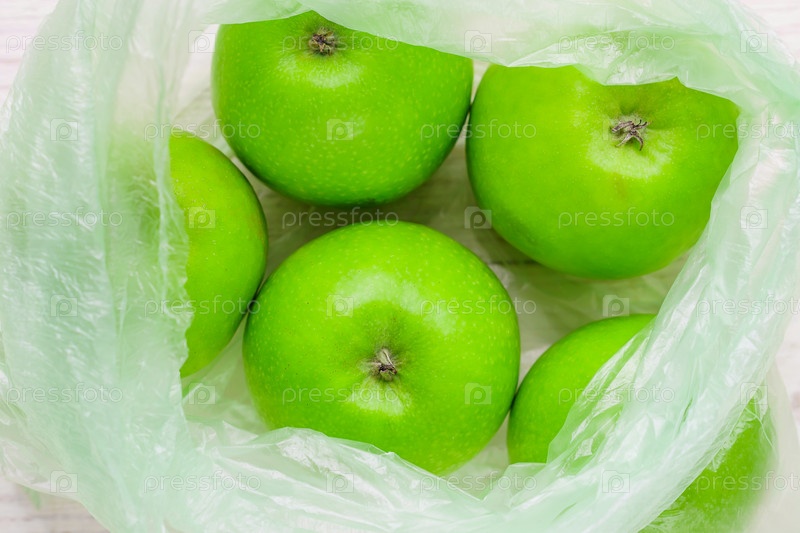 Свежие зеленые яблоки в полиэтиленовом пакете на деревянном столе. экологическая концепция неэкологического использования пластика