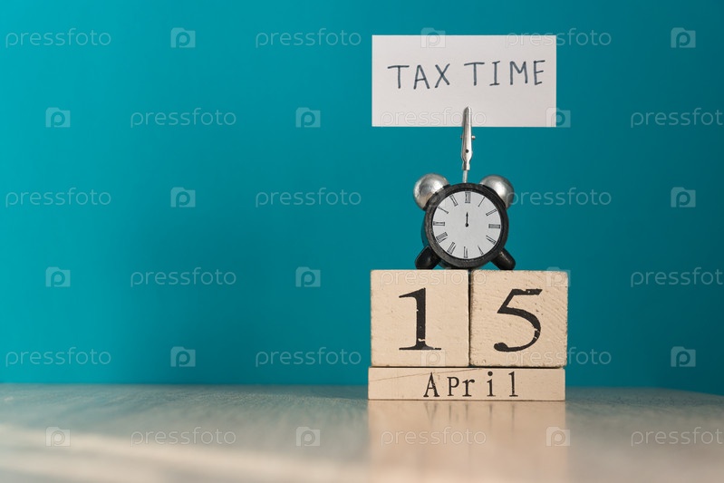 Концепция напоминания о налоговом дне. 15 апреля деревянный календарь и будильник с баннером и рукописной фразой "налоговое время" на деревянном столе