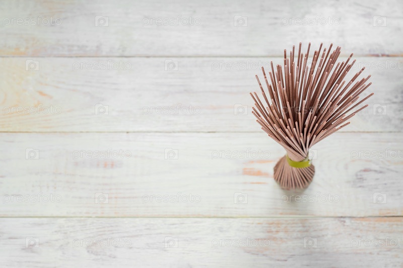 Стек сырой лапши соба на белом деревянном столе. Традиционная японская еда. Вид сверху