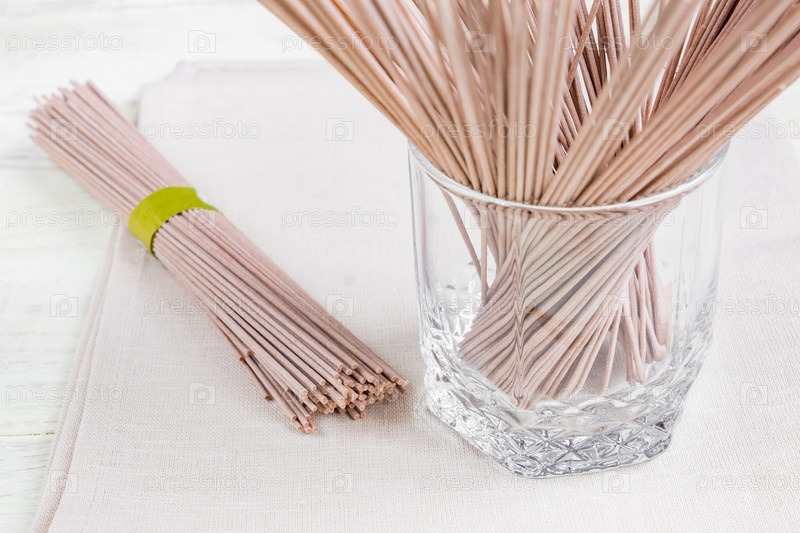 Сырая лапша соба на белом деревянном столе. Традиционная японская еда. Вид сверху