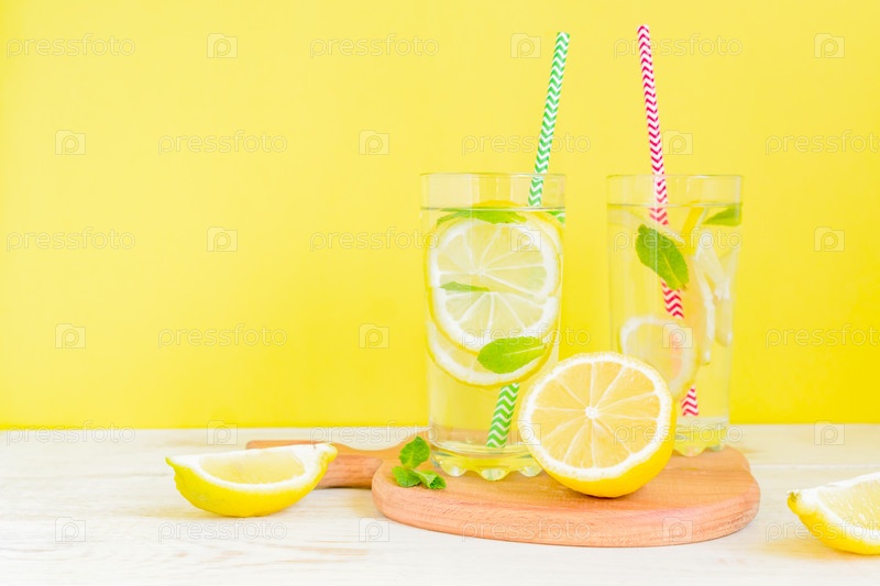 Домашний лимонад с лимоном и мятой на цветном желтом фоне. Летний холодный коктейль. Копипространство