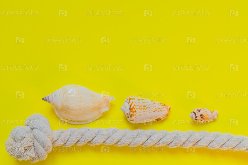 Морские раковины и веревочный узел на ярко-желтом фоне с копировальным пространством. концепция летнего отдыха и отпуска