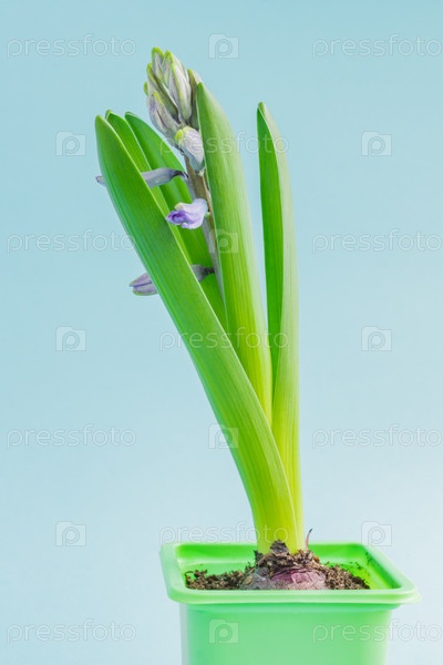Синий цветок гиацинта закрыл бутон в зеленом транспортном горшке на синем фоне. Скопируйте пространство