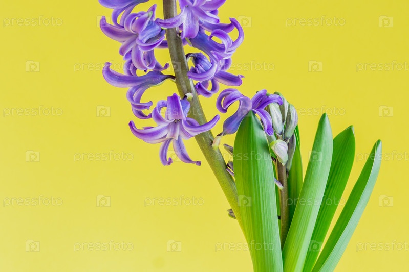 Закройте цветок цветущего голубого гиацинта на желтом фоне