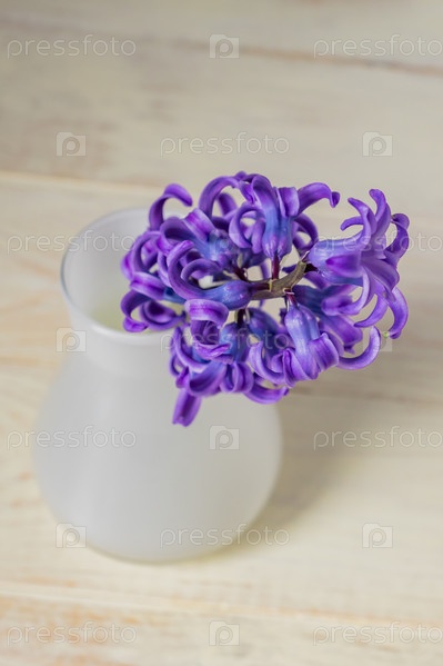 Красивый фиолетовый цветущий гиацинт в вазе из белого стекла на деревянном столе. Весенний букет для украшения интерьера, креативный фон с копией пространства