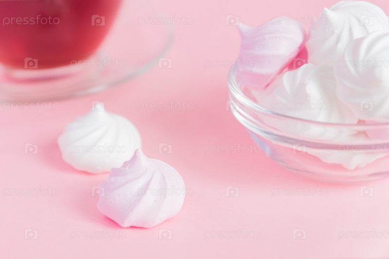 Белые и розовые витые безе на розовом фоне. Французский десерт, приготовленный из взбитых с сахаром и запеченных яичных белков. Открытка с копией пространства