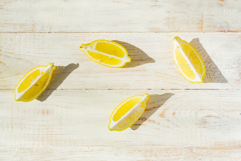 Вид сверху на четверть лимонов, разбросанных по деревянному столу. Жесткие тени в солнечный день