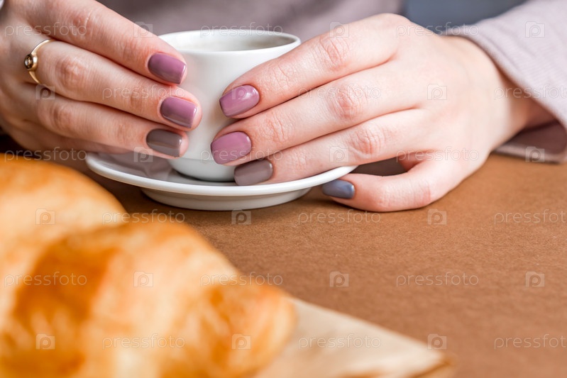 Женские руки с маникюром держат чашку кофе и едят круассан. Завтрак во французском стиле