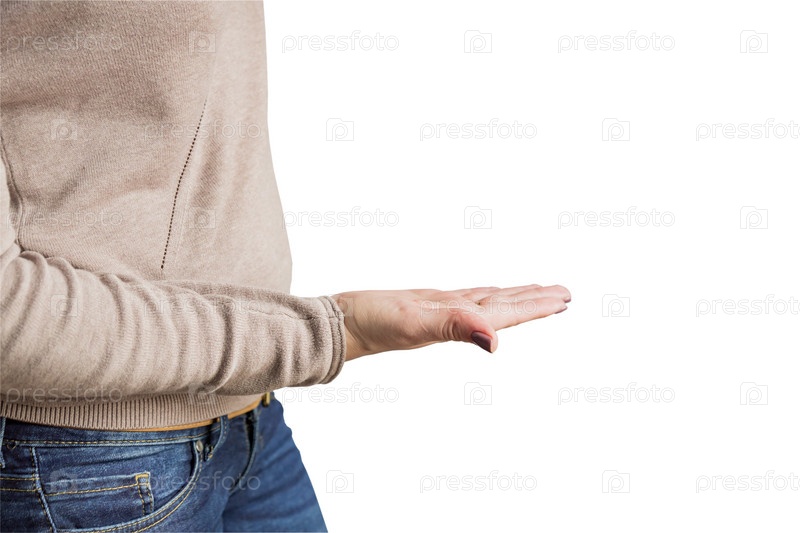Пустая женская рука показывает пустое пространство для копирования на открытой ладони для текста, белый фон