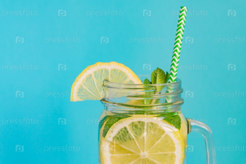 Стакан каменщика домашнего лимонада с лимонами, мятой и бумажной соломой на бирюзовом фоне. Летний освежающий напиток