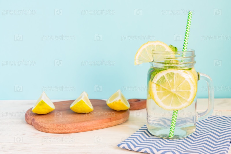Цитрусовая лимонадная вода с нарезанным лимоном и мятой, здоровый и детокс-напиток летом на деревянном столе с синим светлым фоном