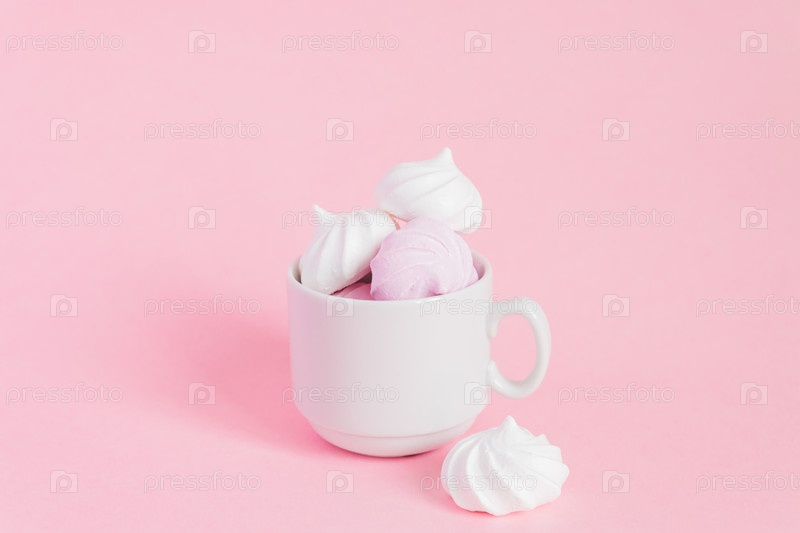 Белые и розовые витые безе в маленькой фарфоровой кофейной чашке на розовом фоне. Французский десерт, приготовленный из взбитых с сахаром и запеченных яичных белков. Открытка с копией пространства