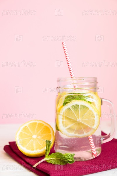 Цитрусовая лимонадная вода с нарезанным лимоном и мятой, здоровый и детокс-напиток летом на деревянном столе с пастельно-розовым фоном