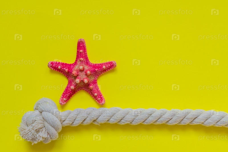 Красная морская звезда и веревочный узел на ярко-желтом фоне с копировальным пространством. концепция летнего отдыха и отпуска