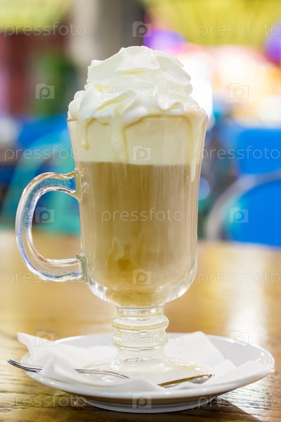 Стеклянная чашка кофе латте со взбитыми сливками на деревянном столе