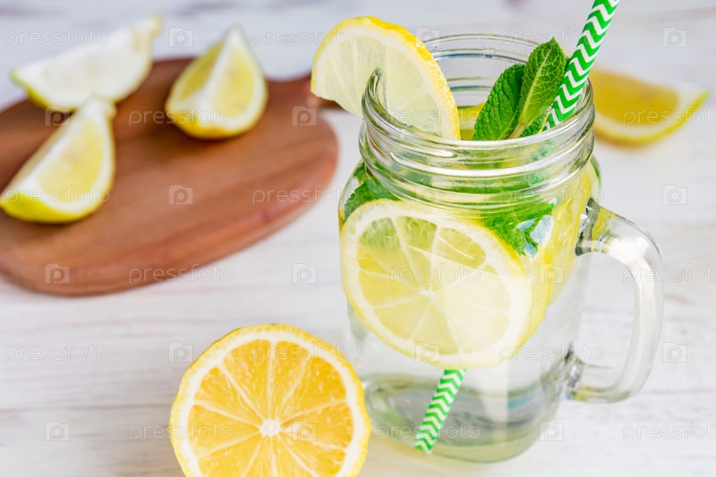 Стакан каменщика домашнего лимонада с лимонами, мятой и зеленой бумажной соломой на деревянном деревенском фоне. Летний освежающий напиток