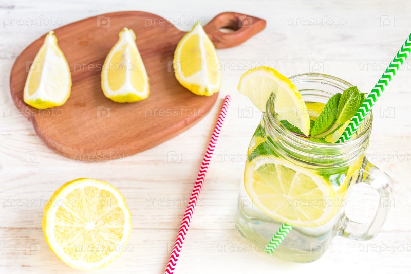 Стакан каменщика домашнего лимонада с лимонами, мятой и зеленой бумажной соломой на деревянном деревенском фоне. Летний освежающий напиток