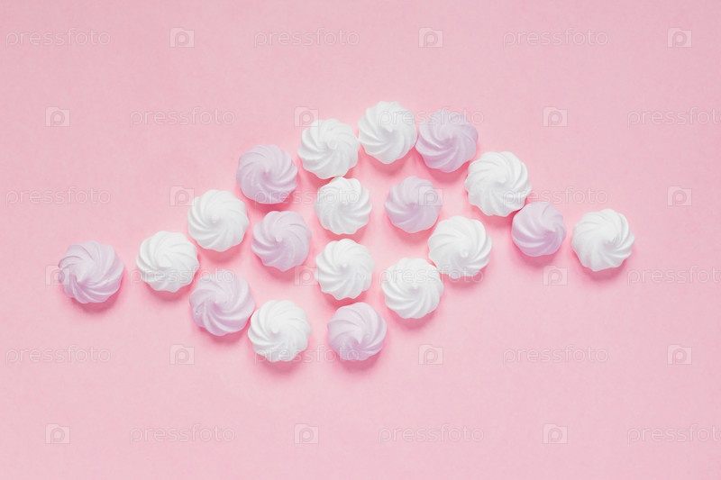 Вид сверху на белые и розовые скрученные безе на розовом фоне. Французский десерт, приготовленный из взбитых с сахаром и запеченных яичных белков. Открытка с копией пространства