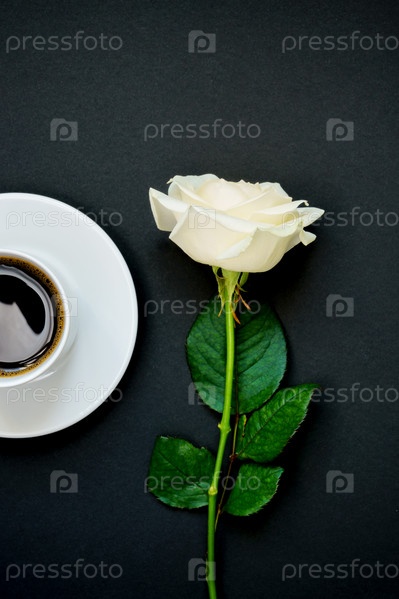 Чашка черного кофе и белая роза на черном фоне, вид сверху, пространство для копирования