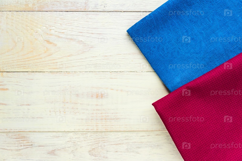 Вид сверху на тканевые салфетки синего и бордового цветов на деревенском белом фоне. Скопируйте место для текста