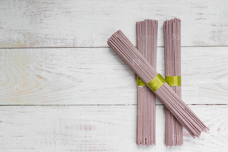 Сырая лапша соба на белом деревянном столе. Традиционная японская еда. Вид сверху, пространство для копирования