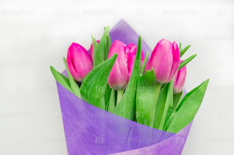 Красивый весенний букет розовых тюльпанов на белом фоне. Вид сверху