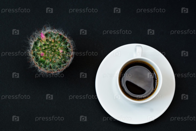 Чашка черного кофе и цветущий кактус на черном фоне, вид сверху, пространство для копирования