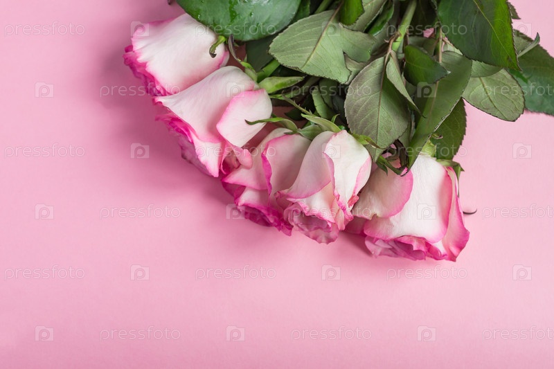 Букет розовых цветущих роз на пастельно-розовом фоне. Романтическая цветочная рамка. Копировать пространство