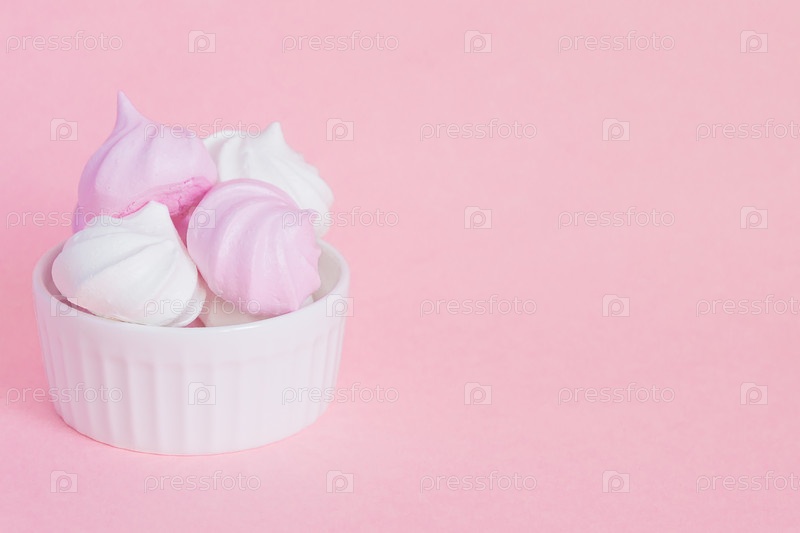 Белые и розовые скрученные безе в фарфоровой миске на розовом фоне, поздравительная открытка, копия пространства