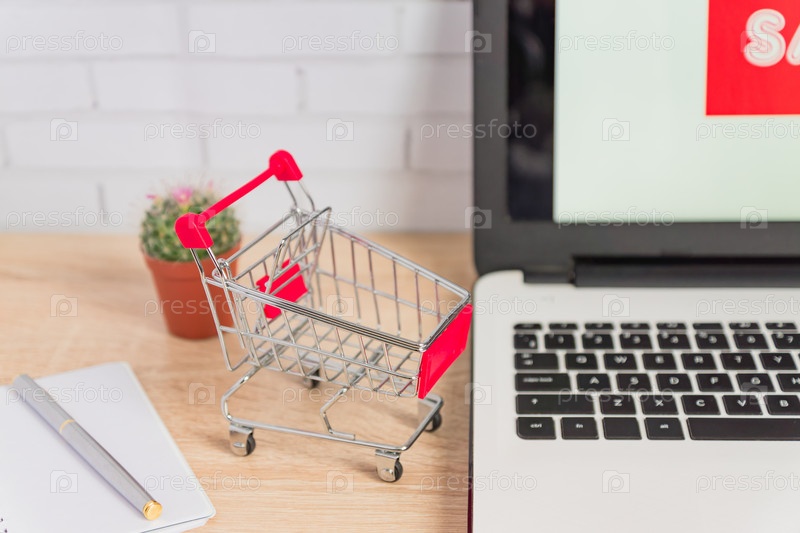 Маленькая красная корзина или тележка на клавиатуре ноутбука, концепция онлайн-покупок технологического бизнеса