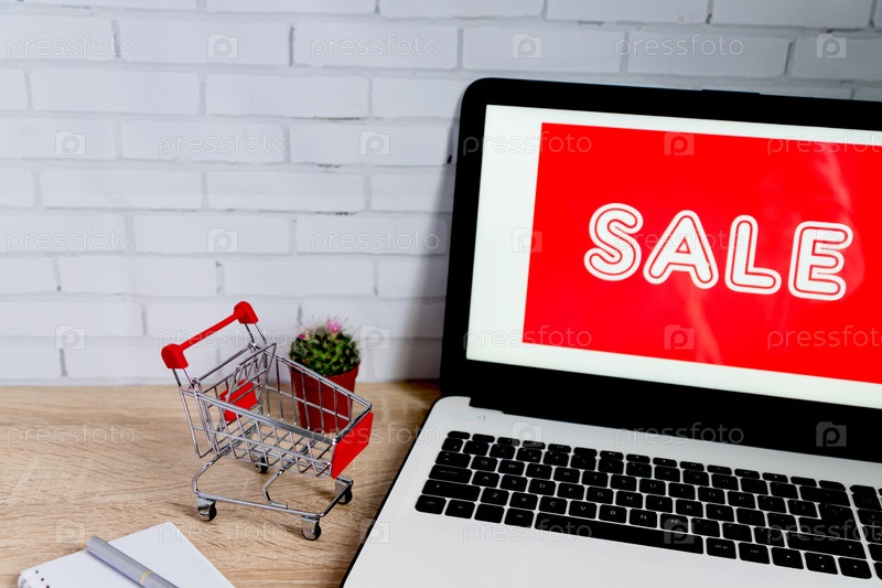 Маленькая красная корзина для покупок или тележка рядом с ноутбуком, концепция онлайн-покупок технологического бизнеса