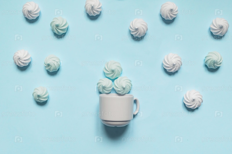 Белые витые безе в фарфоровой миске на синем фоне, поздравительная открытка, копия пространства