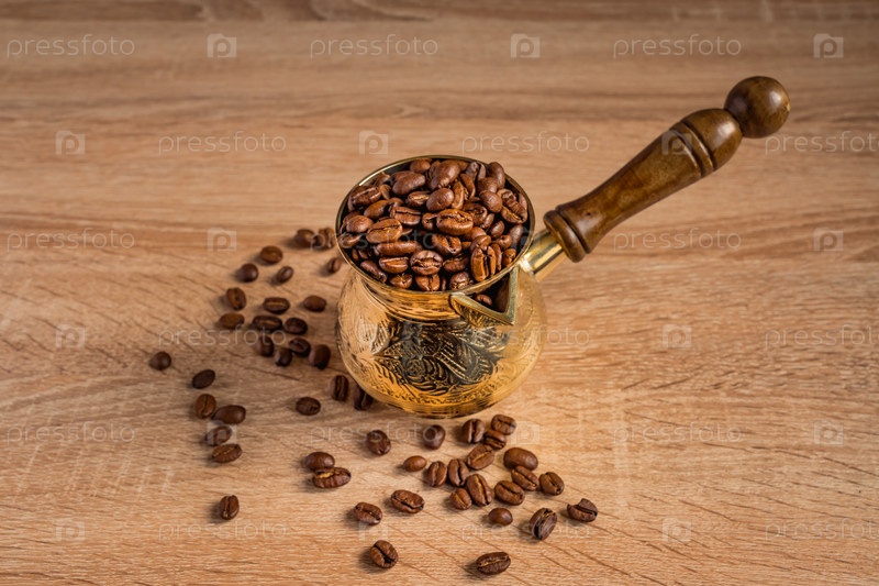 Крупный план свежих жареных кофейных зерен в джезве (традиционный турецкий кофейник) на деревянном столе