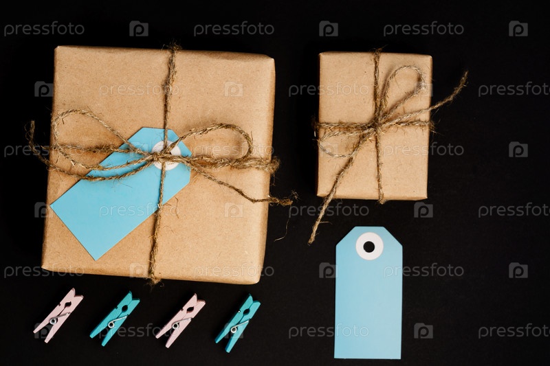 Подарочные коробки ручной работы, завернутые в крафт-бумагу, с синей бумажной карточкой, веревкой и деревянными прищепками для украшения
