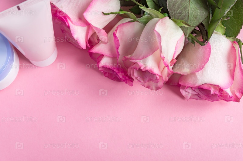 Розовые цветущие розы и крем для лица на пастельно-розовом фоне. Романтическая цветочная рамка по уходу за кожей. Копировать пространство