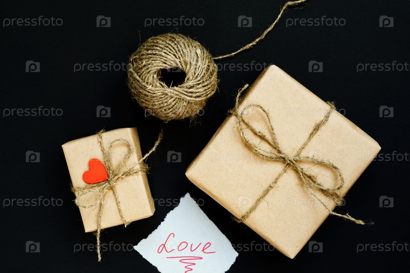 Подарочная коробка ручной работы, завернутая в крафт-бумагу с красным деревянным сердцем, веревкой и бантом на черном фоне. Вид сверху, плоская планировка