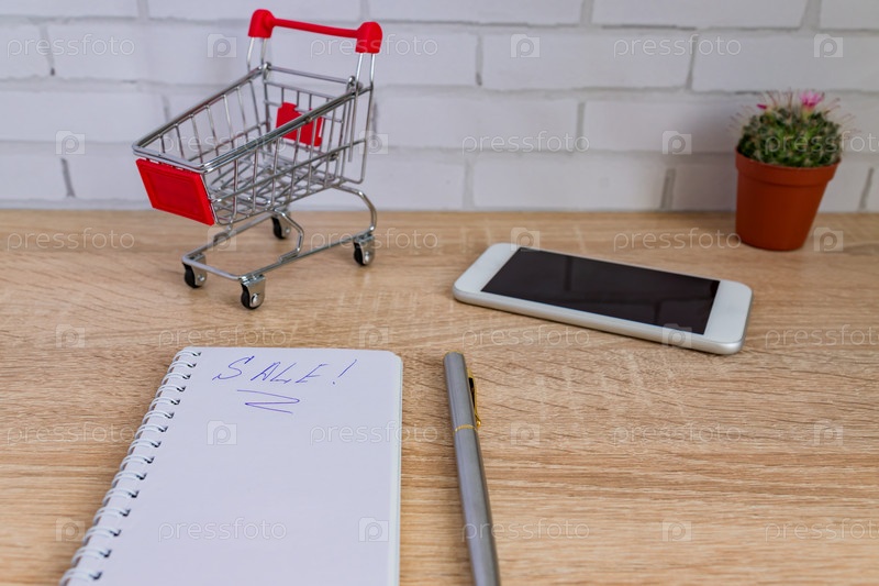 Крупный план офисного стола с белым смартфоном, заметка с текстом продажи и небольшая корзина для покупок. Концепция интернет-магазинов технологического бизнеса