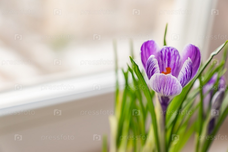 Крупным планом фиолетовые крокусы в цвету на подоконнике. Весенние цветы, домашнее садоводство