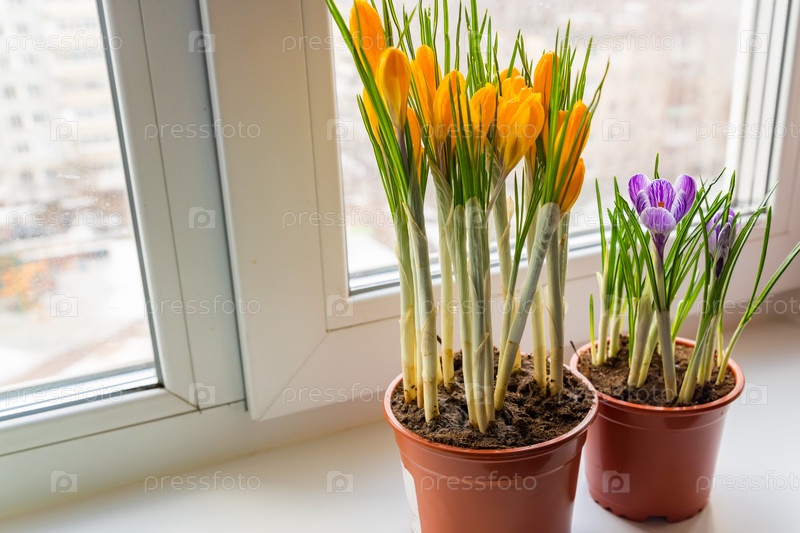 Желтые и фиолетовые крокусы в пластиковом горшке на подоконнике. Весенние цветы, домашнее садоводство