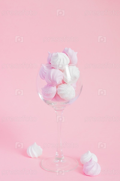 Белые и розовые витые безе в бокале на розовом фоне. Французский десерт, приготовленный из взбитых с сахаром и запеченных яичных белков. Открытка с копией пространства