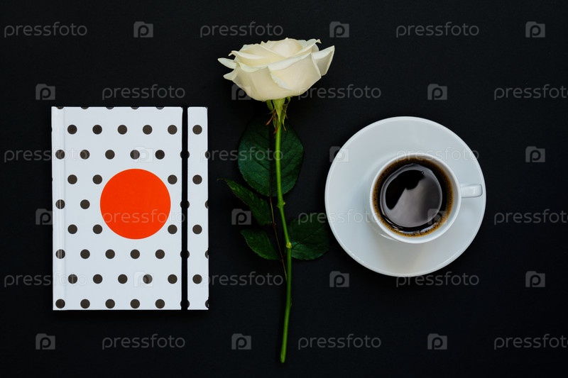 Чашка черного кофе, блокнот и белая роза на черном фоне, вид сверху, пространство для копирования